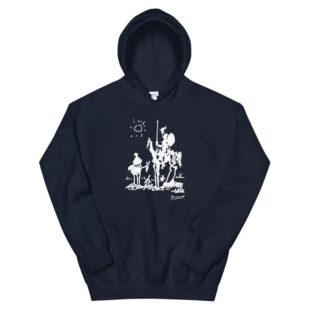 This amazinghoodie features a sketch made in 1955 of Don Quijote de la Mancha, his horse Rocinante, his squire Sancho Panza and his donkey Dapple, the sun, and several windmills. The bold lines, almost scribbles, that compose the figures are stark against a plain, white background.